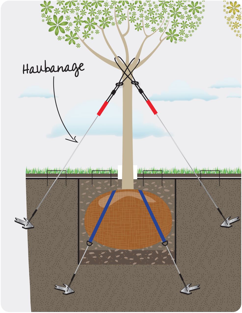 Les haubans doivent être reliés aux deux-tiers de la hauteur de l’arbre pour apporter un maximum de sécurité. La fixation par trois points est optimale pour sa répartition des efforts et garanti un soutien performant quel que soit l’orientation du vent.